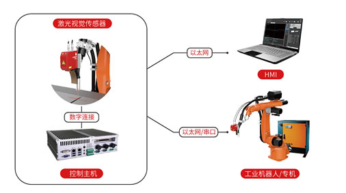 當(dāng)激光條紋照射焊接表面以形成激光條紋(激光結(jié)構(gòu)光)時,傳感器上的透鏡在光敏檢測器上產(chǎn)生焊接橫截面的輪廓,即反映焊接橫截面形狀的激光條紋圖像。激光條紋圖像在視覺控制下進行處理,提取焊縫的特征數(shù)據(jù),如跟蹤點坐標(biāo)、焊縫間隙、錯位和橫截面積等。視覺系統(tǒng)根據(jù)測量的焊縫位置信息計算焊槍的路徑,并將路徑數(shù)據(jù)傳輸給機器人。機器人實時控制運行路徑,以確保焊炬始終與焊縫對齊。同時,視覺系統(tǒng)還可以根據(jù)測量的焊縫尺寸數(shù)據(jù)計算出所需的焊接參數(shù),如焊接速度、電弧電壓、焊接電流、擺動幅度等。這些焊接參數(shù)可以通過以太網(wǎng)傳輸給機器人,機器人可以控制焊接速度和焊槍的擺動,或者控制焊機的電源來調(diào)整焊接參數(shù),從而實現(xiàn)自適應(yīng)焊接參數(shù)控制。