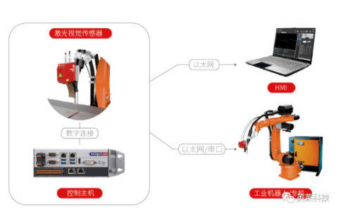 激光視覺焊縫跟蹤系統(tǒng)由焊縫跟蹤傳感器及控制主機組成,傳感器負責(zé)焊縫信息的主動采集,控制主機負責(zé)焊縫信息的實時處理,并與工業(yè)機器人或焊接專機保持實時通訊,讓工業(yè)機器人或焊接專機實現(xiàn)焊縫尋位、焊縫實時跟蹤的功能,識別焊縫偏移矯正焊接軌跡,實現(xiàn)真正的智能化焊接。