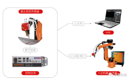 激光視覺焊縫跟蹤系統(tǒng)由焊縫跟蹤傳感器及控制主機組成,傳感器負責(zé)焊縫信息的主動采集,控制主機負責(zé)焊縫信息的實時處理,并與工業(yè)機器人或焊接專機保持實時通訊,讓工業(yè)機器人或焊接專機實現(xiàn)焊縫尋位、焊縫實時跟蹤的功能,識別焊縫偏移矯正焊接軌跡,實現(xiàn)真正的智能化焊接。