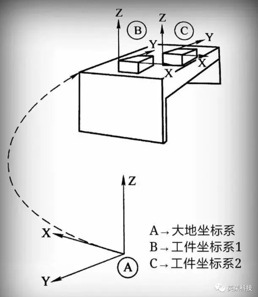 工件坐標(biāo)系:它定義工件相對(duì)于大地坐標(biāo)系(或其他坐標(biāo)系)的位置,如下圖所示。
